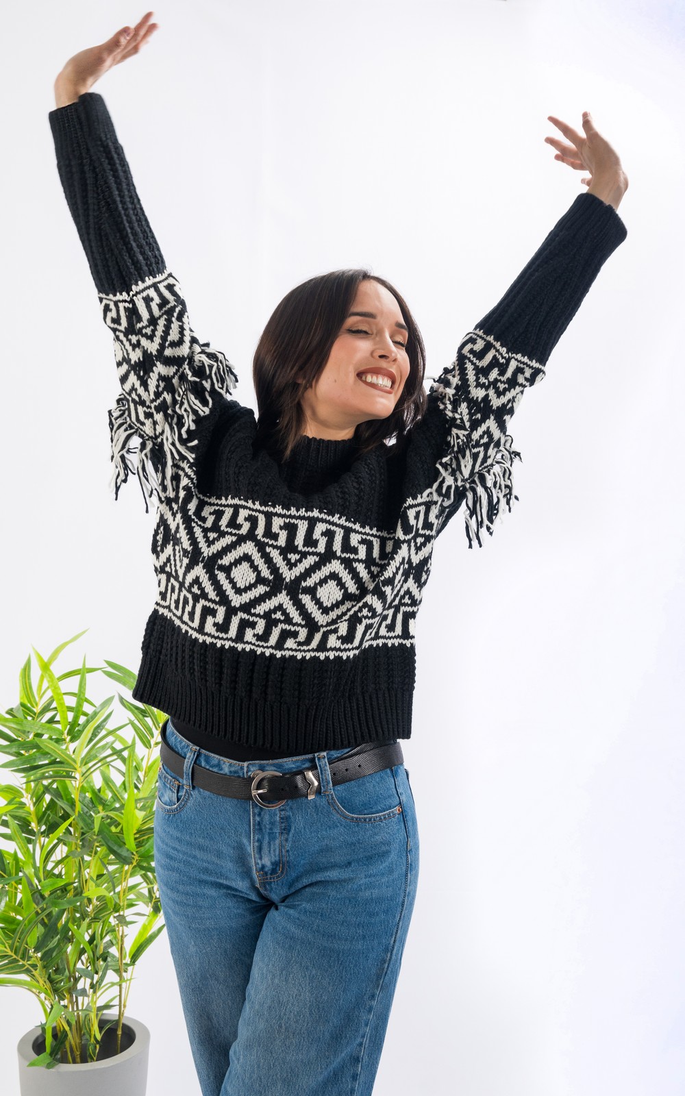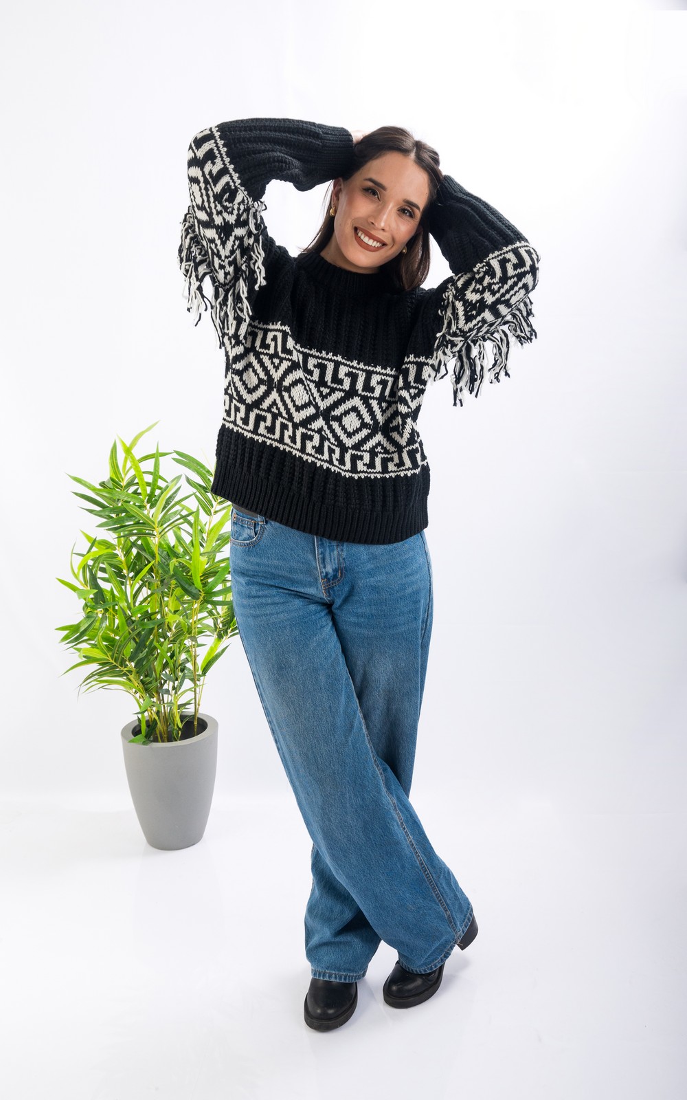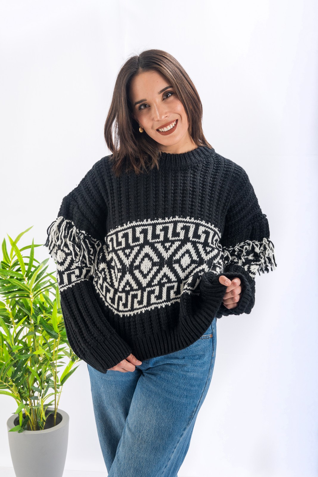 Este sweater combina calidez y estilo con un diseño étnico único. Su tejido grueso y textura acanalada lo hacen ideal para los días fríos, mientras que sus detalles en blanco aportan un toque distintivo que resalta cualquier look invernal.