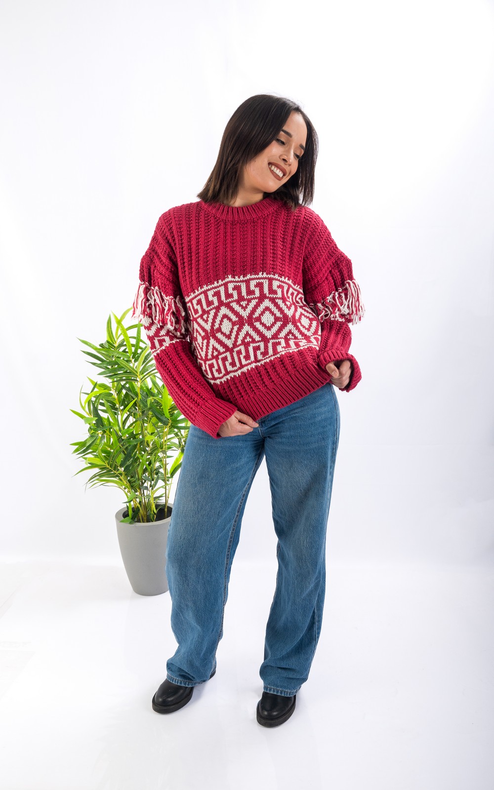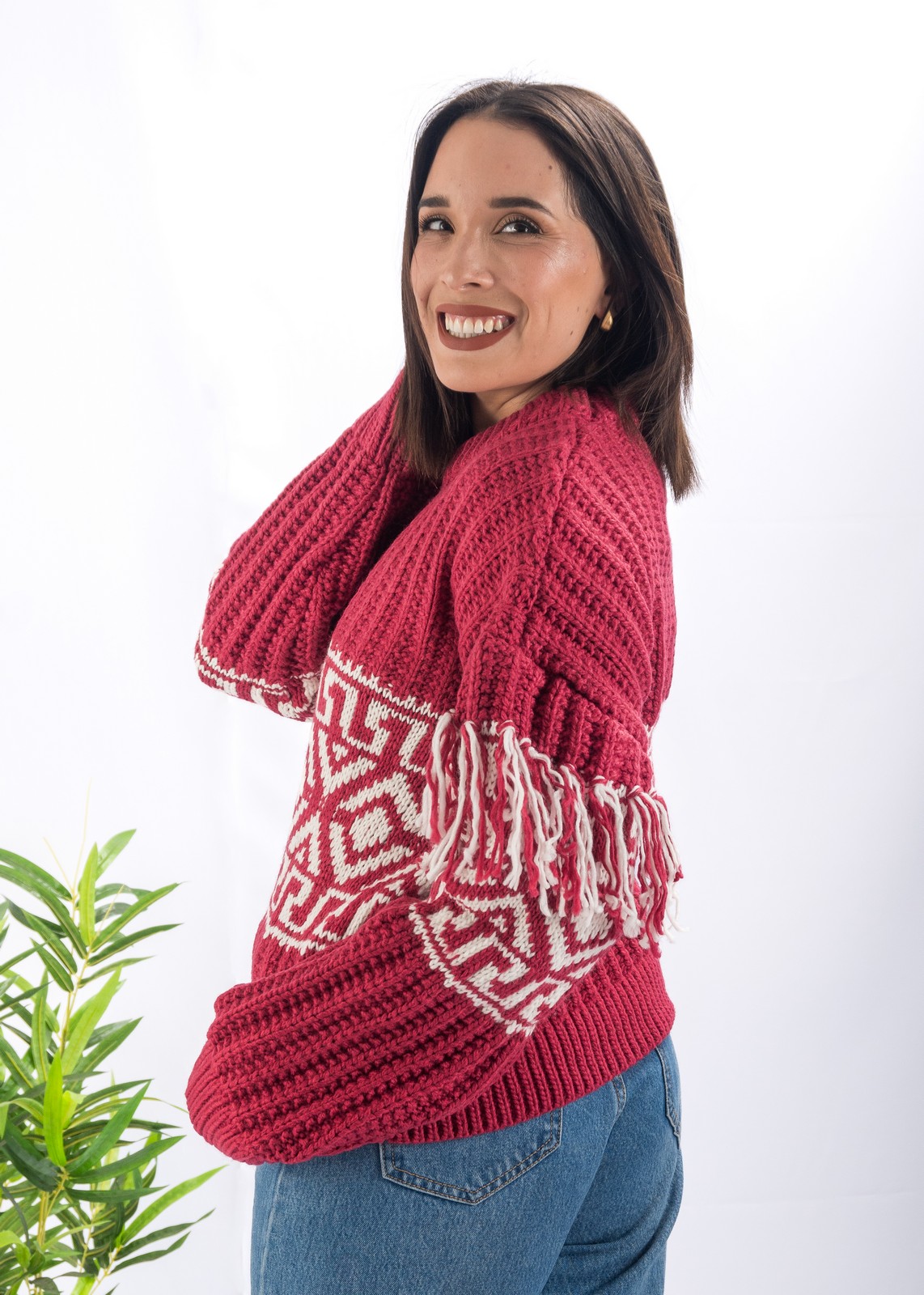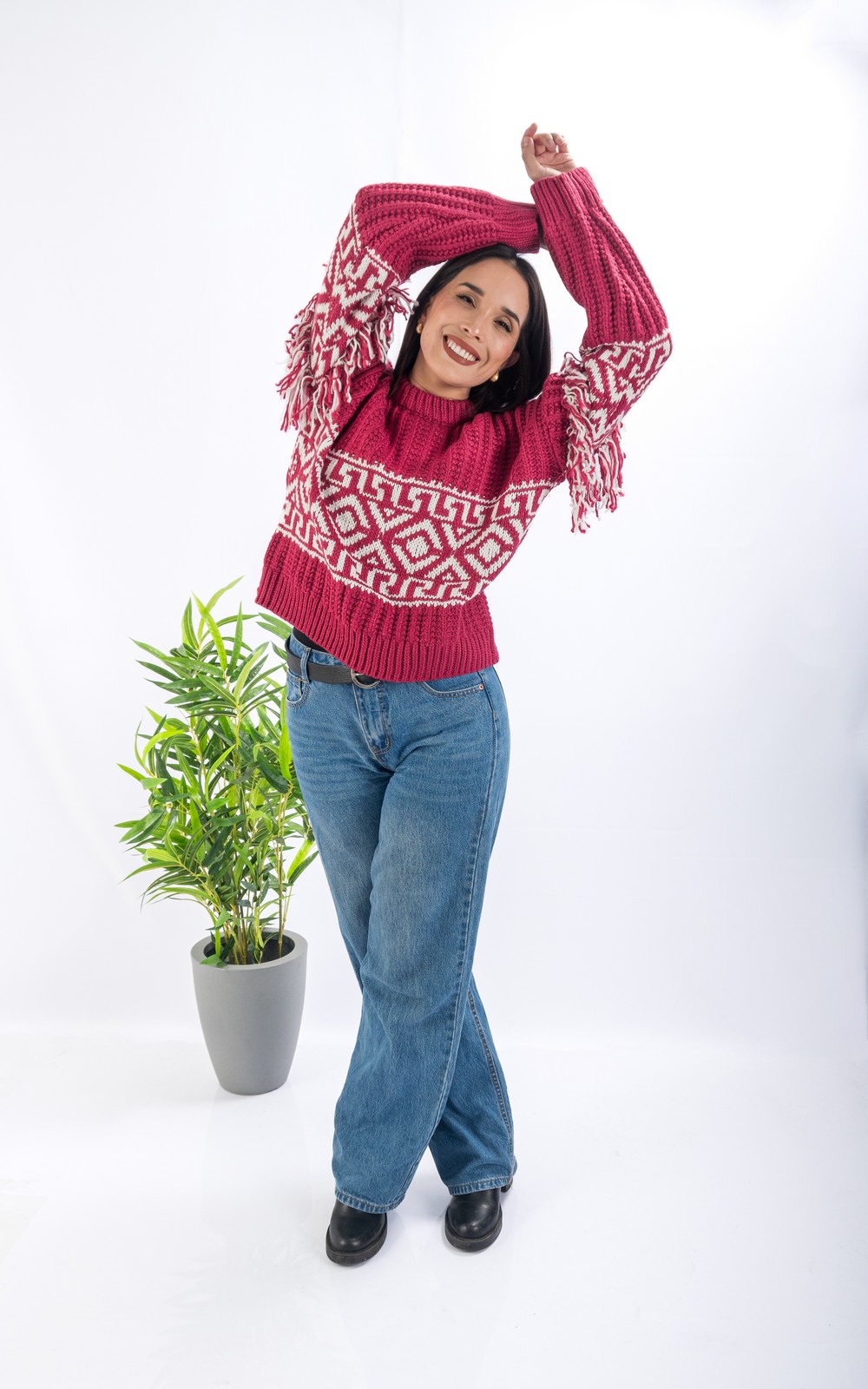 Este sweater combina calidez y estilo con un diseño étnico único. Su tejido grueso y textura acanalada lo hacen ideal para los días fríos, mientras que sus detalles en blanco aportan un toque distintivo que resalta cualquier look invernal.